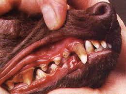 Com o passar do tempo, as placas bacterianas se mineralizam e se transformam em cálculo dentário (popularmente conhecido como 'tártaro'), que são aquelas manchas amarelo-amarronzadas que aparecem nos dentes de cães e gatos. Sugestão: inspecione a boca do seu cão ou gato e veja se ele já possui doença periodontal. Compare com a figura abaixo: